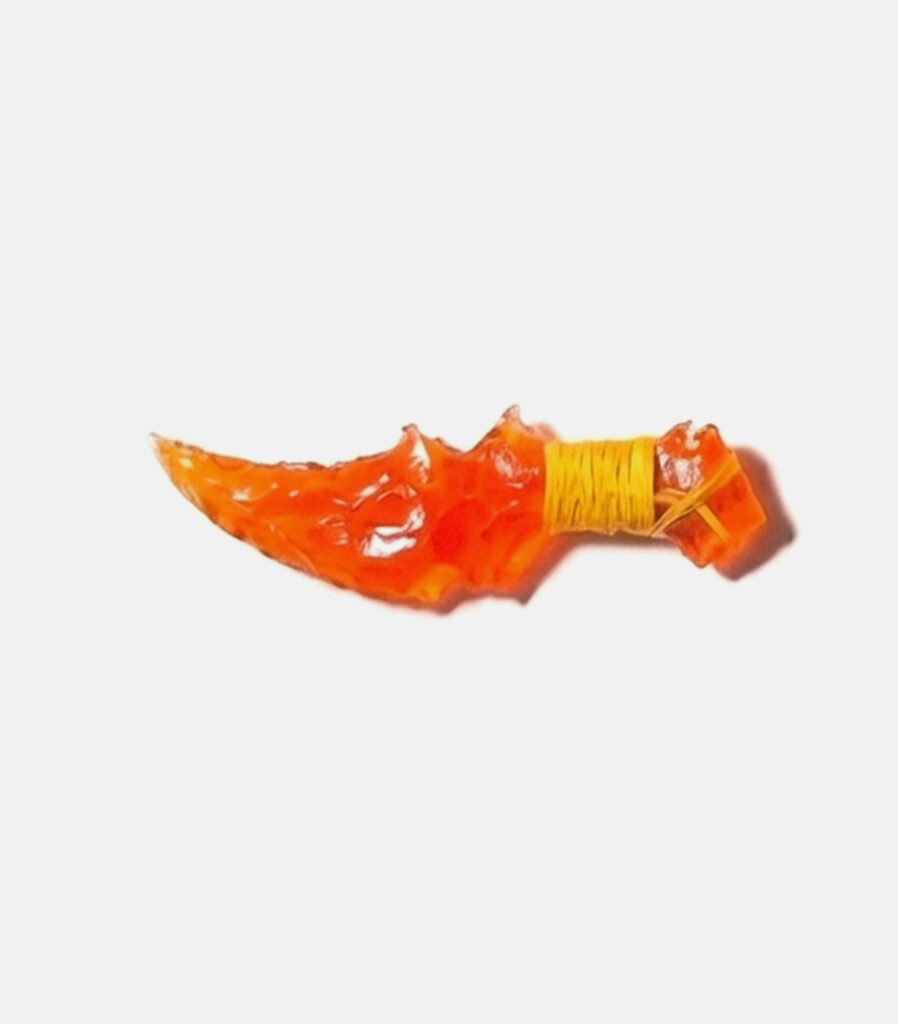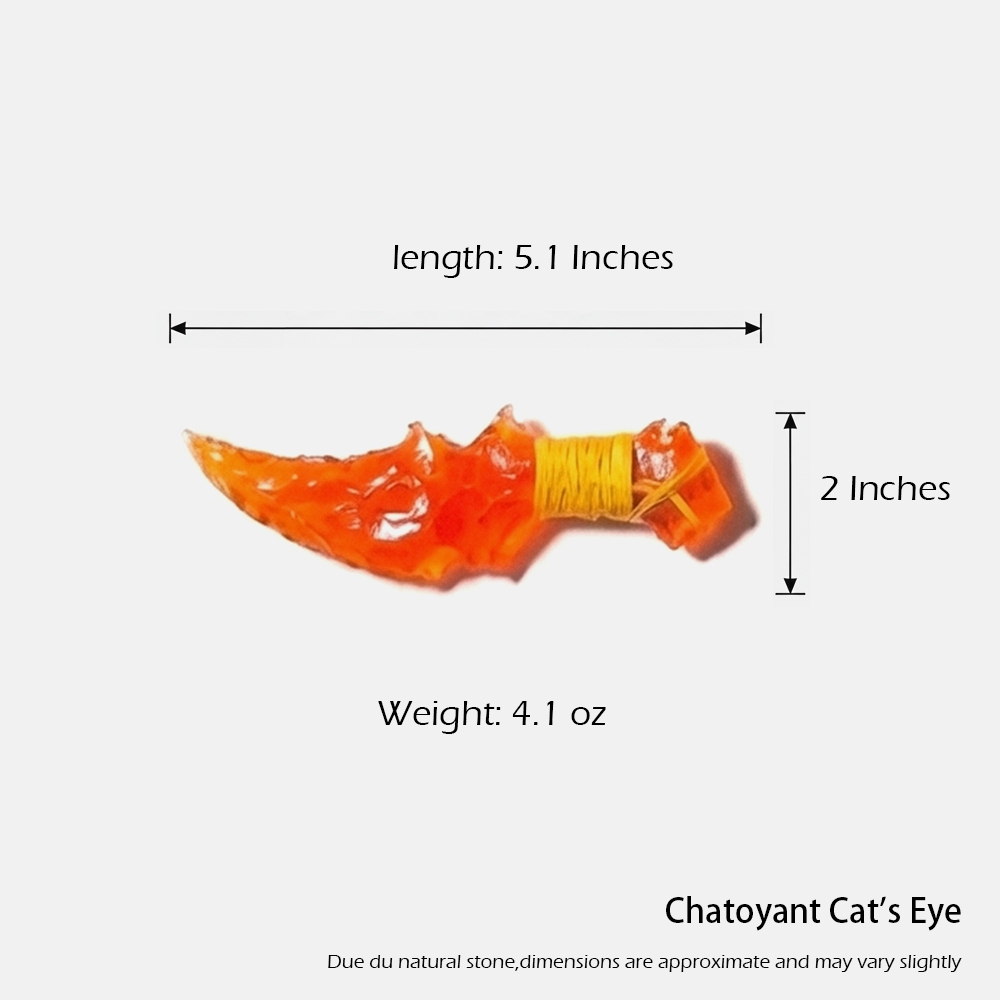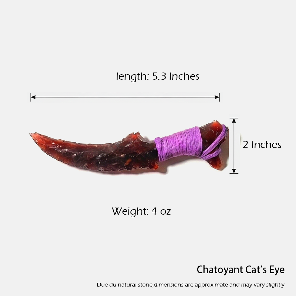 The “Royal Purple Phantom” dagger is an exquisite piece crafted from a singular, stunning piece of purple cat’s-eye stone. The blade radiates a deep, regal purple hue that speaks of nobility and mystery, as if it were forged in the heart of an ancient, enchanted kingdom. The natural chatoyancy within the stone dances like fleeting shadows, lending an ethereal quality to the dagger, as though it possesses a life and will of its own. The design is both majestic and deadly, with smooth contours that enhance its aesthetic appeal while ensuring deadly efficiency. This dagger is not just a weapon; it is a symbol of power, sovereignty, and the enigmatic forces that lie beyond the veil of reality.